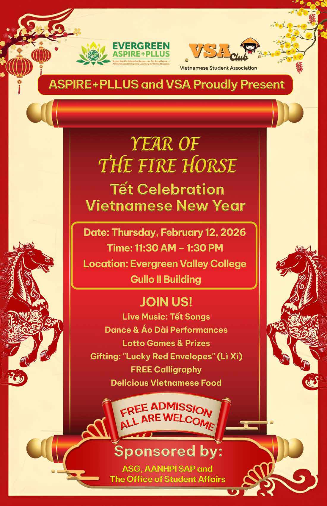 To continue and honor this meaningful tradition, the Vietnamese Student Association (VSA) will be hosting a Tet Celebration for everyone at Evergreen Valley College, creating an opportunity for all to come together, celebrate, and experience Vietnamese culture.